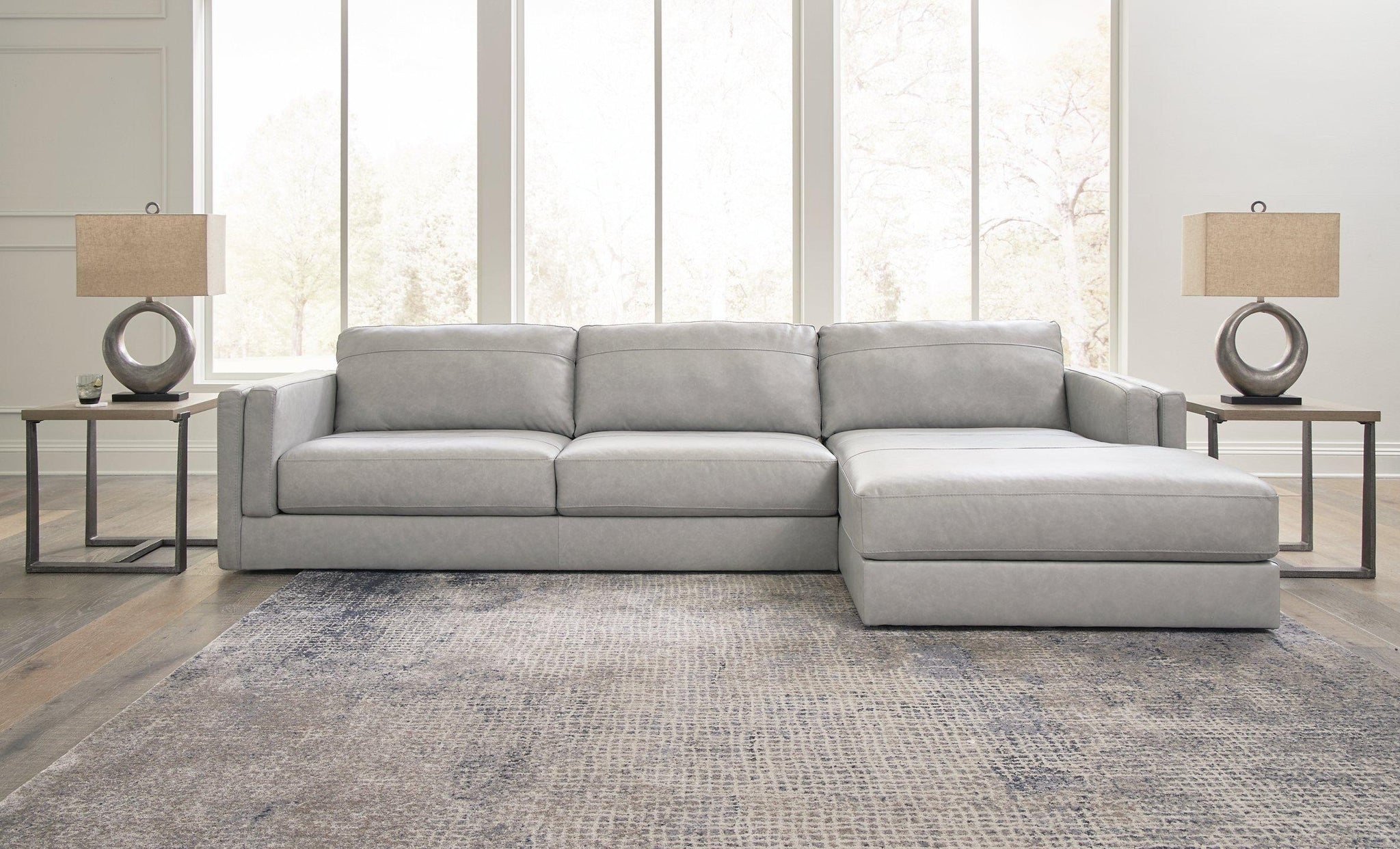 Keen on crisp, contemporary design? Adore the pleasure of leather? Look no further. This sectional with chaise satisfies on every level. Richly textured and decadently supple, the plush cushions are wrapped with expertly matched leather and faux leather upholstery in an on-trend neutral tone. Sleek double-padded arms and a low, clean-lined profile complete this spacious sectional's simply chic appeal.