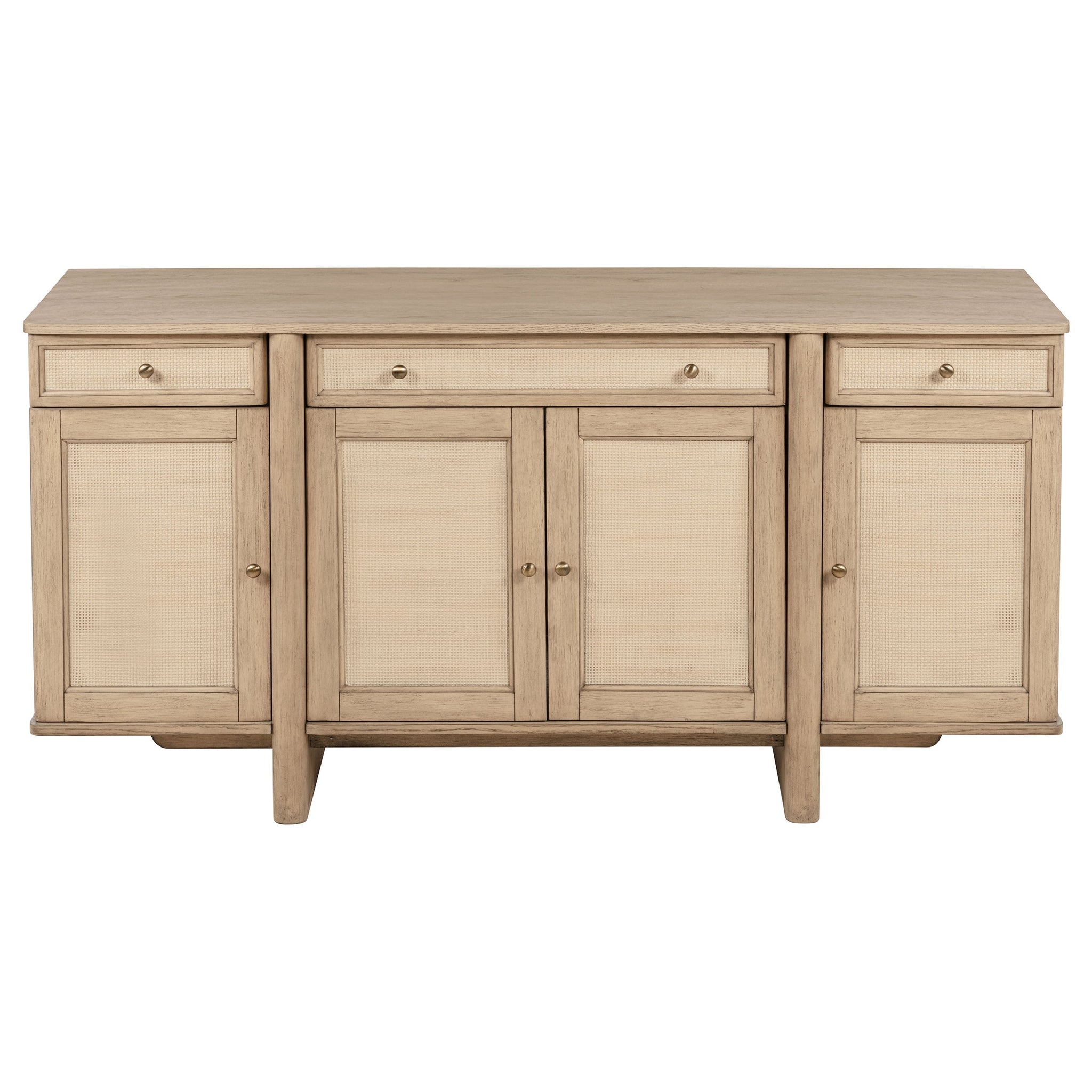 Bring both beauty and functionality to your dining or living space with this elegantly crafted sideboard. Featuring a warm, beige oak wood finish, this sideboard offers ample storage with three spacious drawers and three cabinet compartments behind four doors, perfect for organizing dinnerware, linens, or other essentials. The hand-woven cane door fronts add a touch of artisanal charm, while the adjustable interior shelves provide versatility for your storage needs. The rear cutouts allow for easy cable management, making it suitable for use as an entertainment center or buffet. Whether you’re looking to enhance your dining room, living area, or hallway, this sideboard delivers timeless style and practical functionality.
