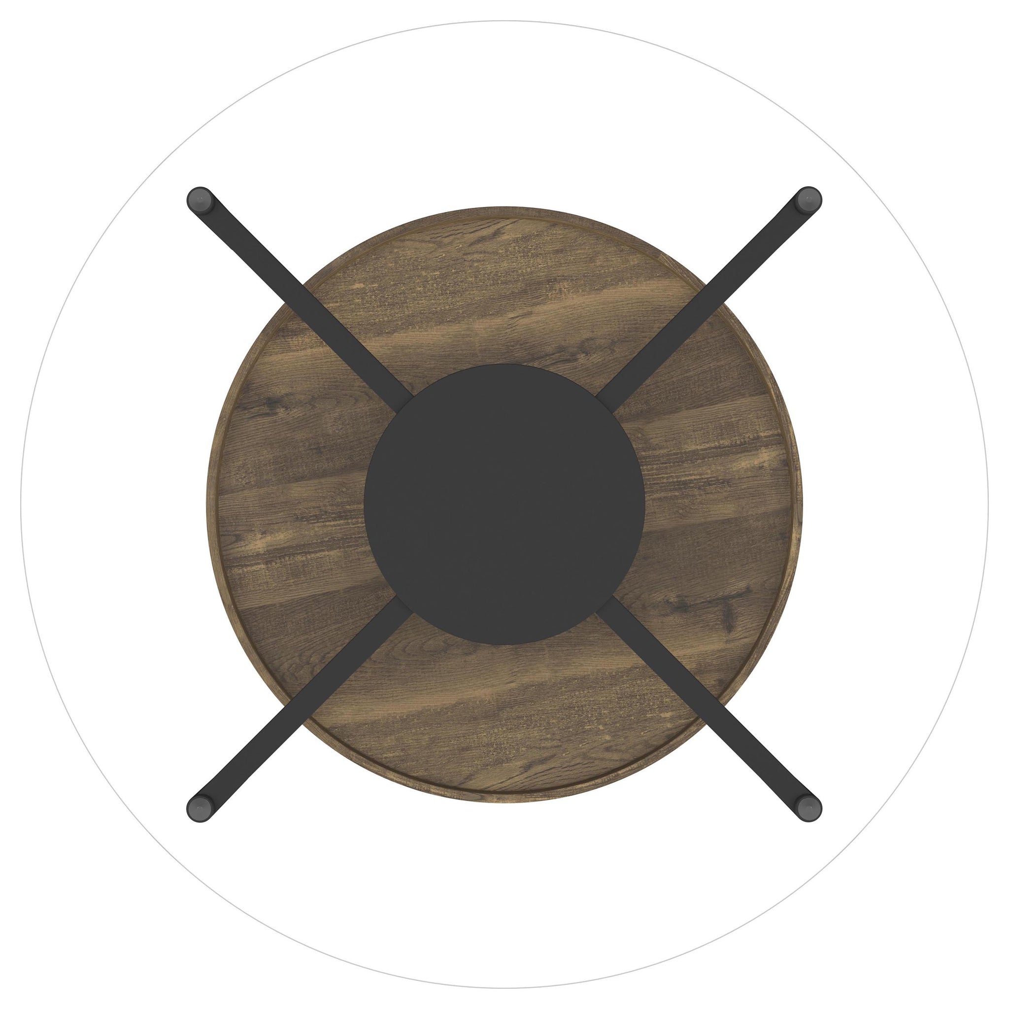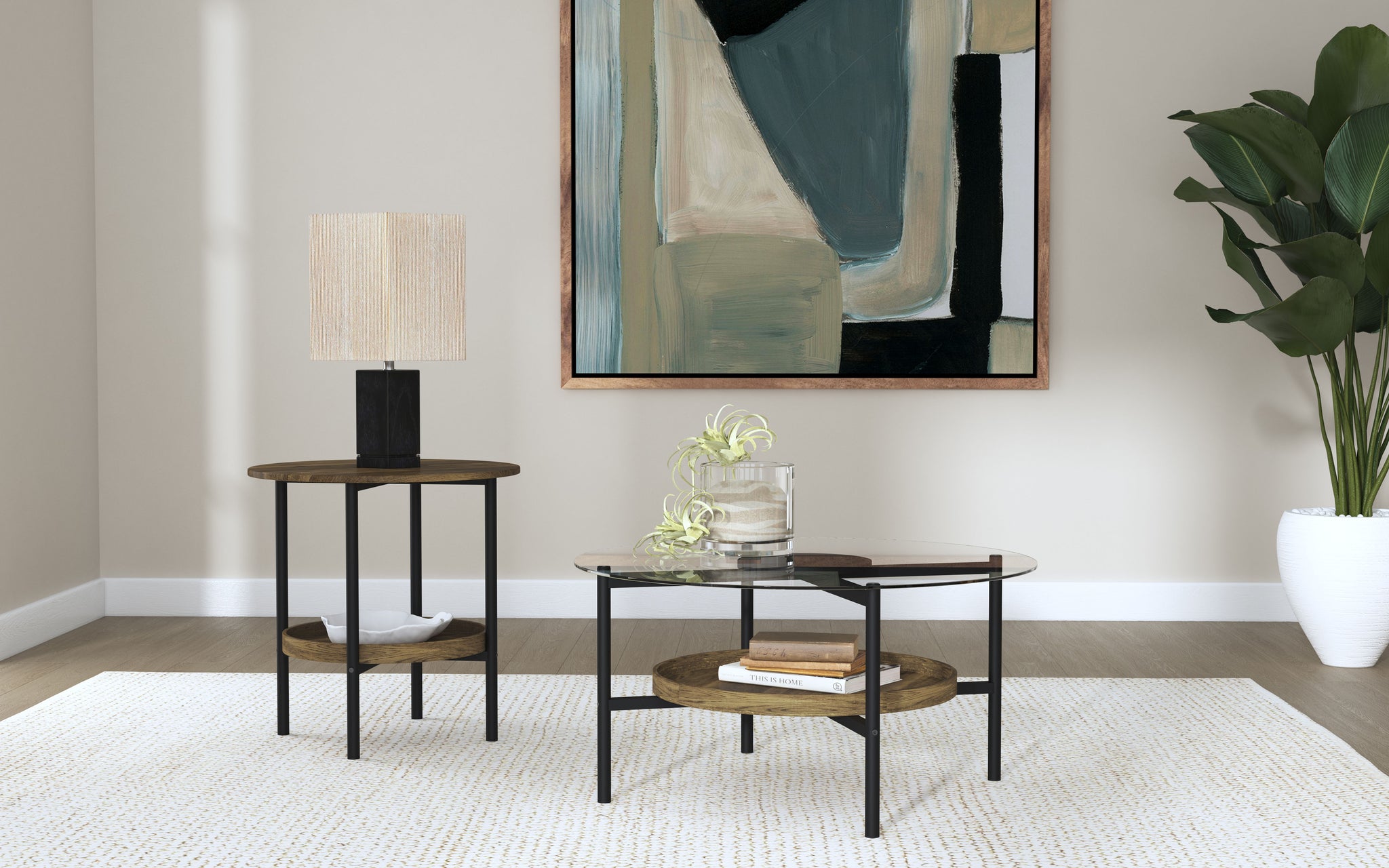 Bring a touch of modern farmhouse style to your living room with this coffee table set, blending sleek metal frames with warm wood accents. The set features a striking design with round tempered glass tops, offering a sophisticated contrast to the black powder-coated metal frames. Each table includes a lower tray-style shelf with a brown wood grain laminate veneer finish, perfect for displaying decor or storing essentials. The sturdy metal construction ensures long-lasting durability, while the minimalist aesthetic complements various living spaces.