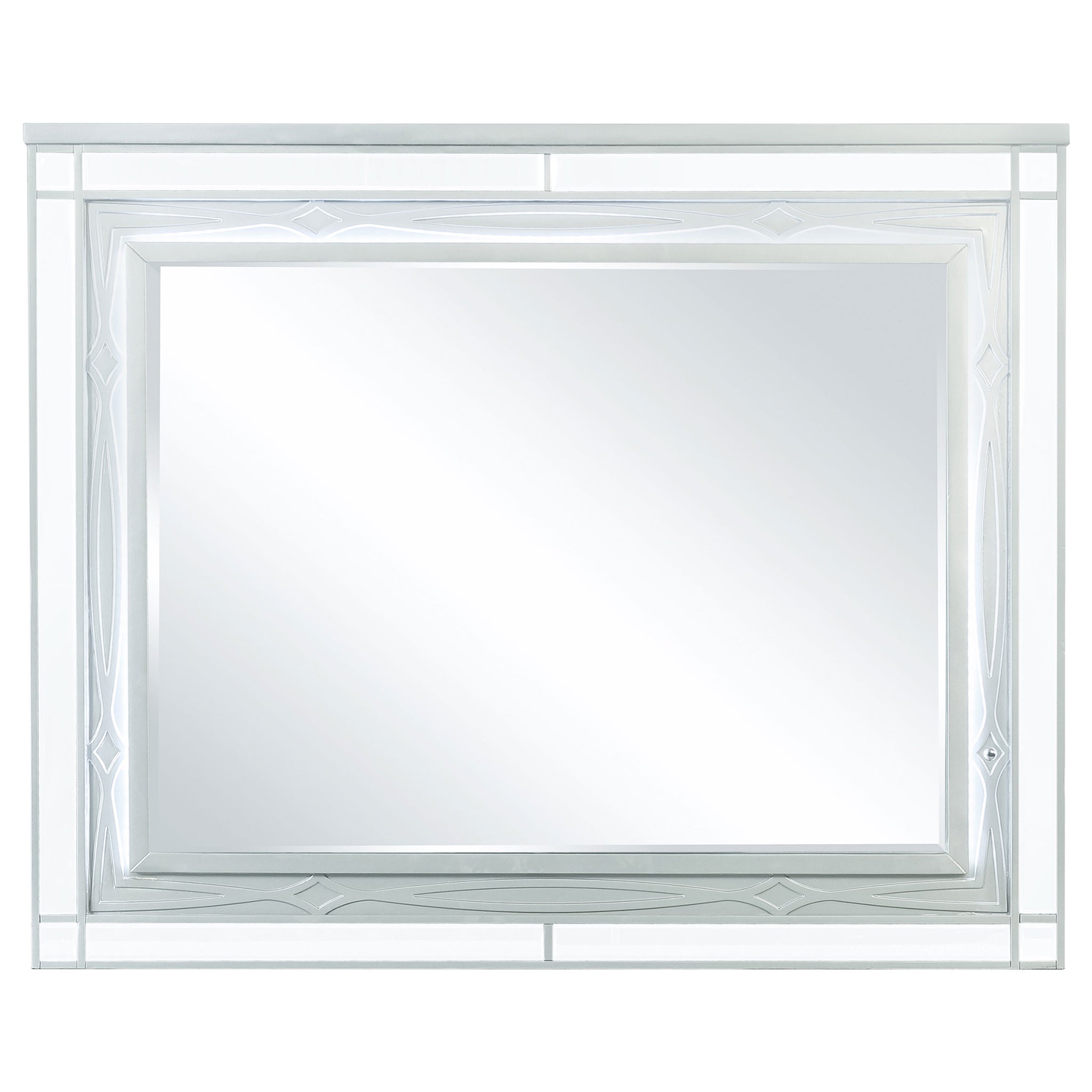 This contemporary 4-piece bedroom set featuring a bed, nightstand, dresser, and mirror imparts a glamorous look and feel to any modern home. Each piece of this exclusive Coaster design comes in a shimmering silver metallic finish that enlivens any space. The imposing bed headboard is upholstered with metallic leatherette that's fully tufted with crystal buttons. The headboard and mirror include white LED touch lighting for a vibrant ambiance, while the nightstand features USB ports. The drawers on each case good are crafted with fret work detail on the front panels and crystal-like pulls, with top drawers lined with black felt to protect your valuables.