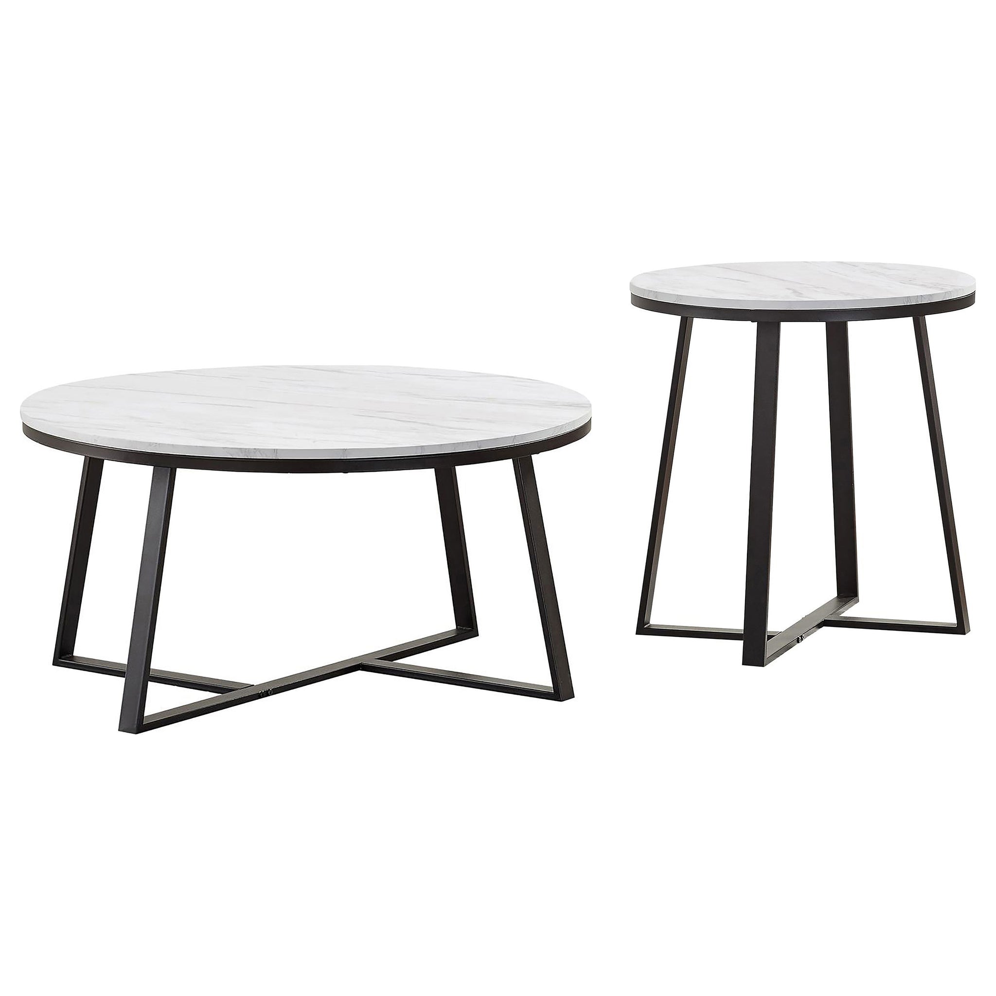 This coffee table set offers a stylish two-tone design that enhances modern living rooms with ease. Featuring round tabletops crafted from white faux marble and subtle grey veining, these tables exude elegance. The intersecting U-shaped legs in matte black powder-coated metal form a striking geometric silhouette. Constructed with engineered wood, PVC laminate, and heavy-gauge metal, the set ensures both durability and contemporary appeal. Ideal as a cohesive centerpiece for any living space.