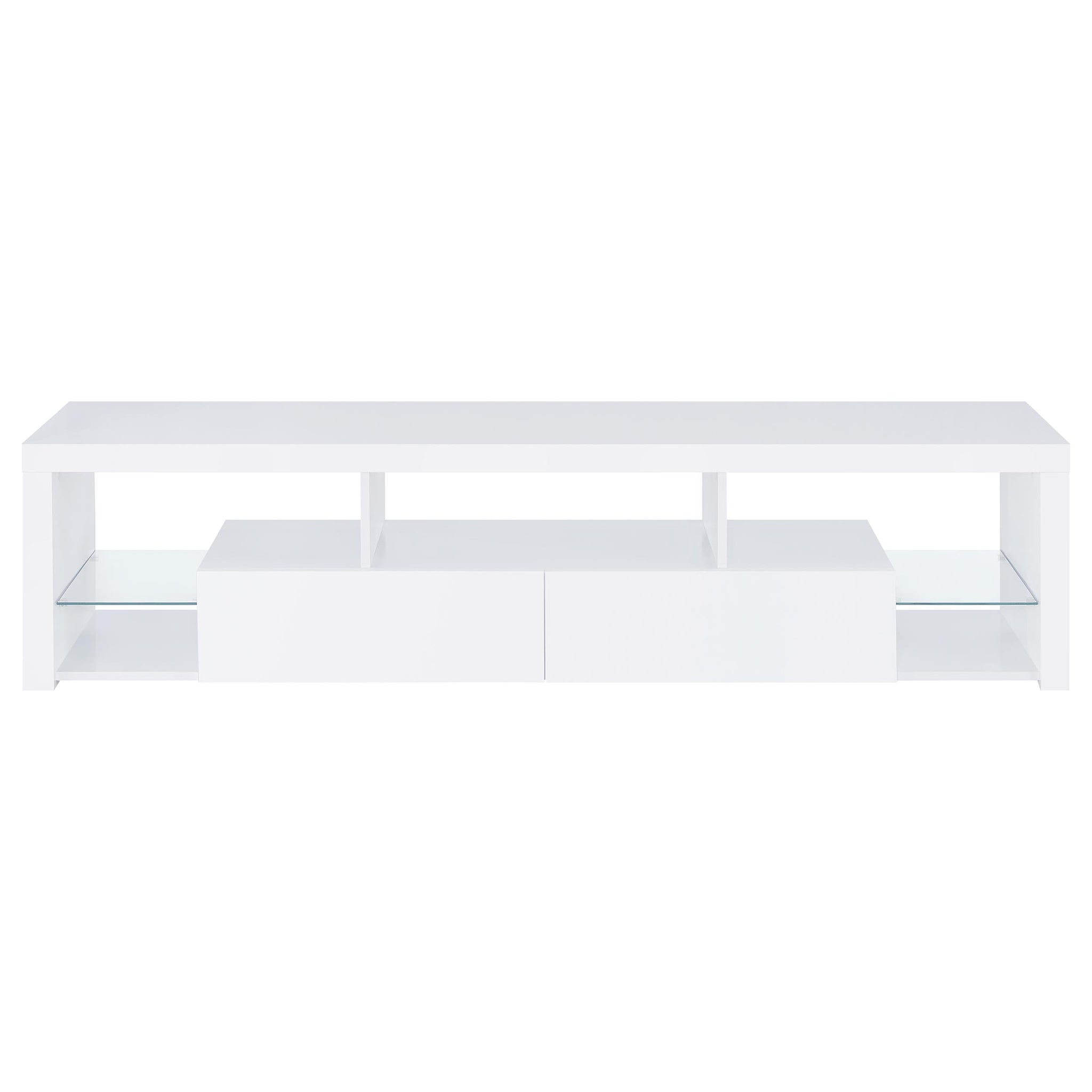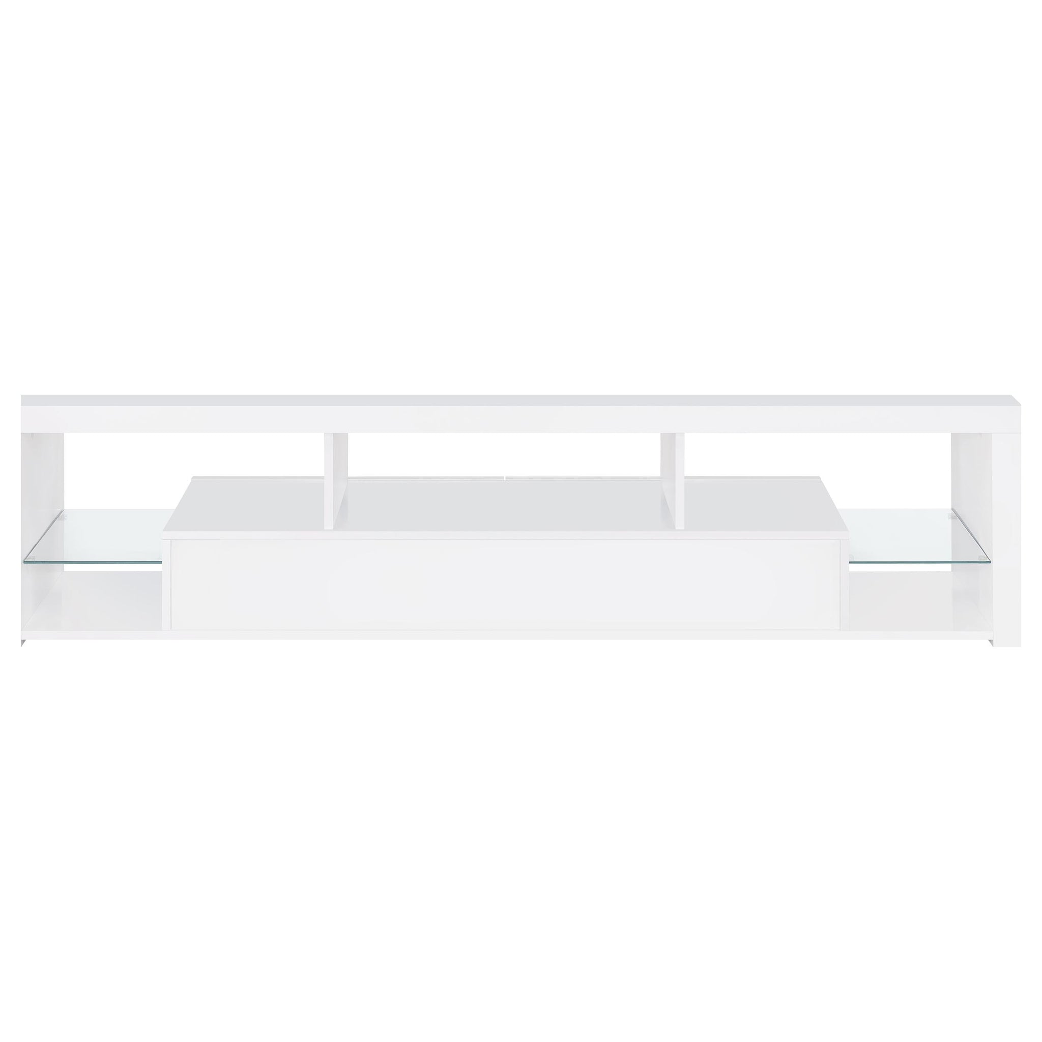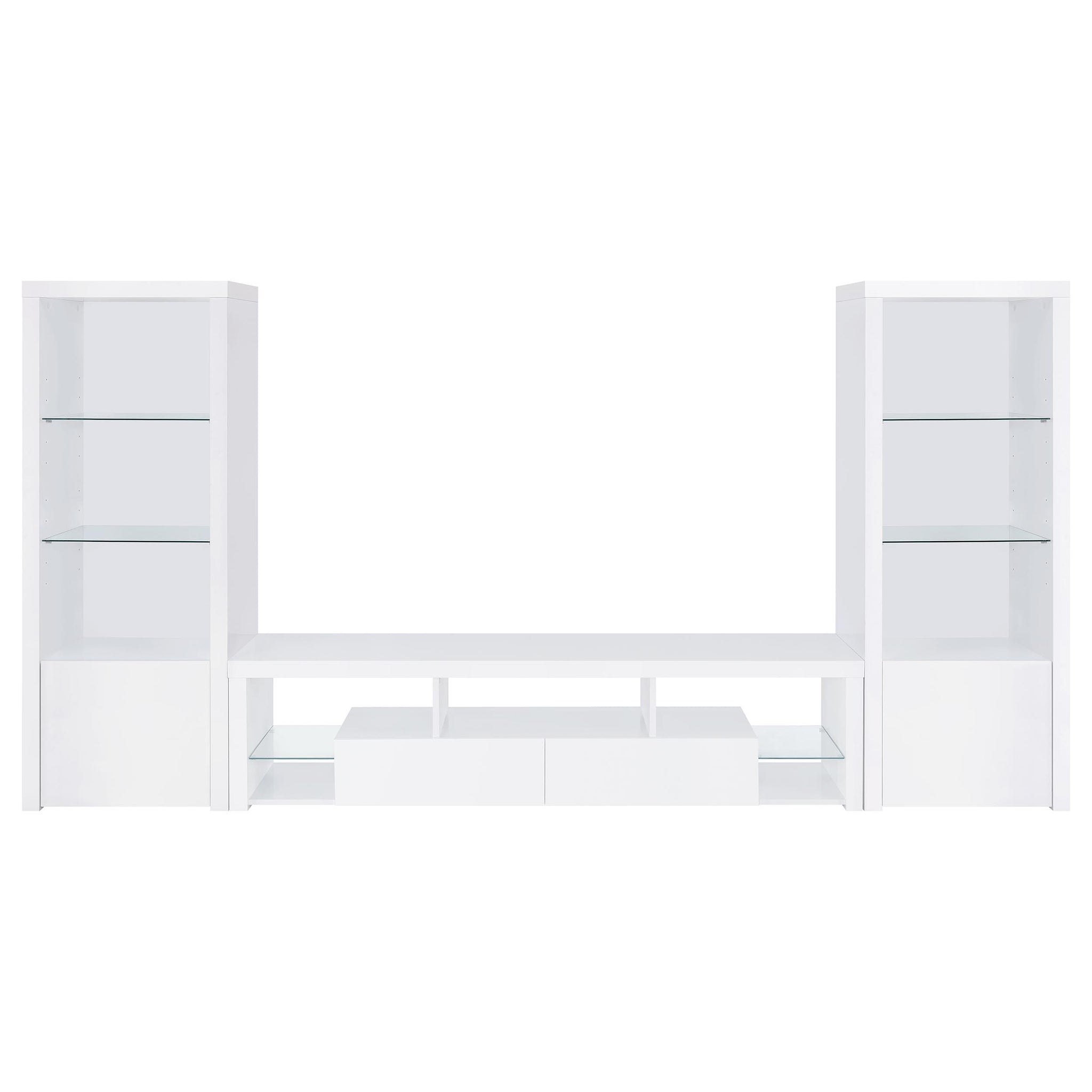 Elevate your entertainment arena with our sleek, modern TV stand. Drenched in a pristine glossy white-on-white finish, it radiates sophistication, accentuated by clear glass details. Its soft-close drawers ensure smooth operation, while glass shelves present a chic display option. Generous storage compartments cater to all your media needs. To enhance the ensemble, the set comes with matching media towers, amplifying storage capacity and offering a unified, stylish appearance. This combo not only meets functional demands but also serves as a captivating focal point in any contemporary space.