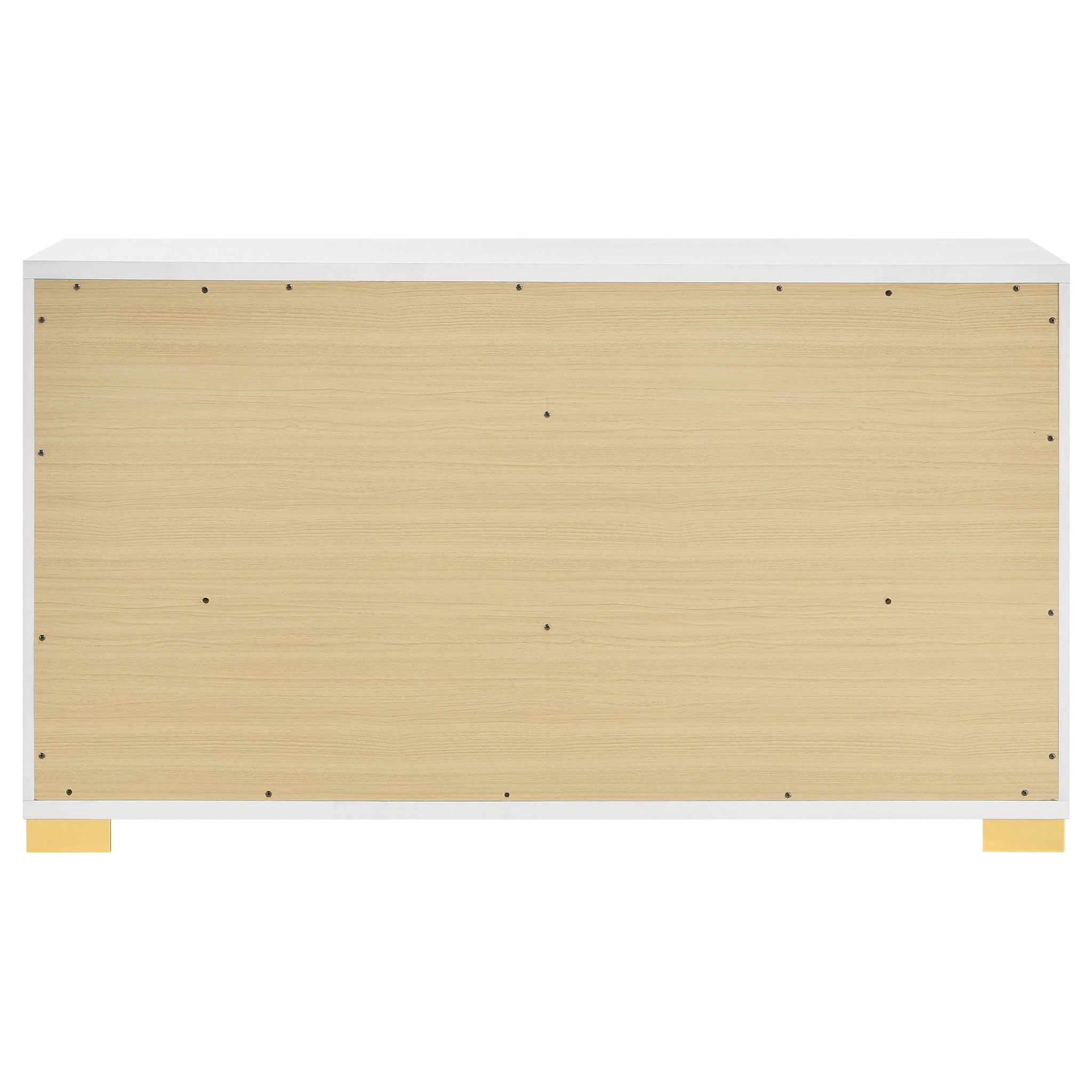 Soak up the sleek and simple yet compelling look of a six-drawer dresser with a dramatic aesthetic that changes the tone of your contemporary bedroom. Modern design details produce a chic vertical dresser with an Art Deco vibe and tons of storage space. Made of wood products, this six-drawer dresser features a versatile finish with glam accenting from gold finish metal, placed carefully to emphasize a geometric linear effect. Store incidentals and accessories in drawers operating smoothly on center metal glides. English dovetail drawer construction embellishes this dresser’s quality, as vertical gold metal drawer hardware offers a unique impact. Key Features: • Sleek and simple six-drawer dresser with dramatic aesthetic to change tone of contemporary bedroom • Modern design details with chic Art Deco vibe and tons of storage space • Made of wood products with versatile finish and gold finish metal accenting for geometric linear effect • Drawers operating smoothly on center metal glides with English dovetail drawer construction • Vertical gold metal drawer hardware for unique impact