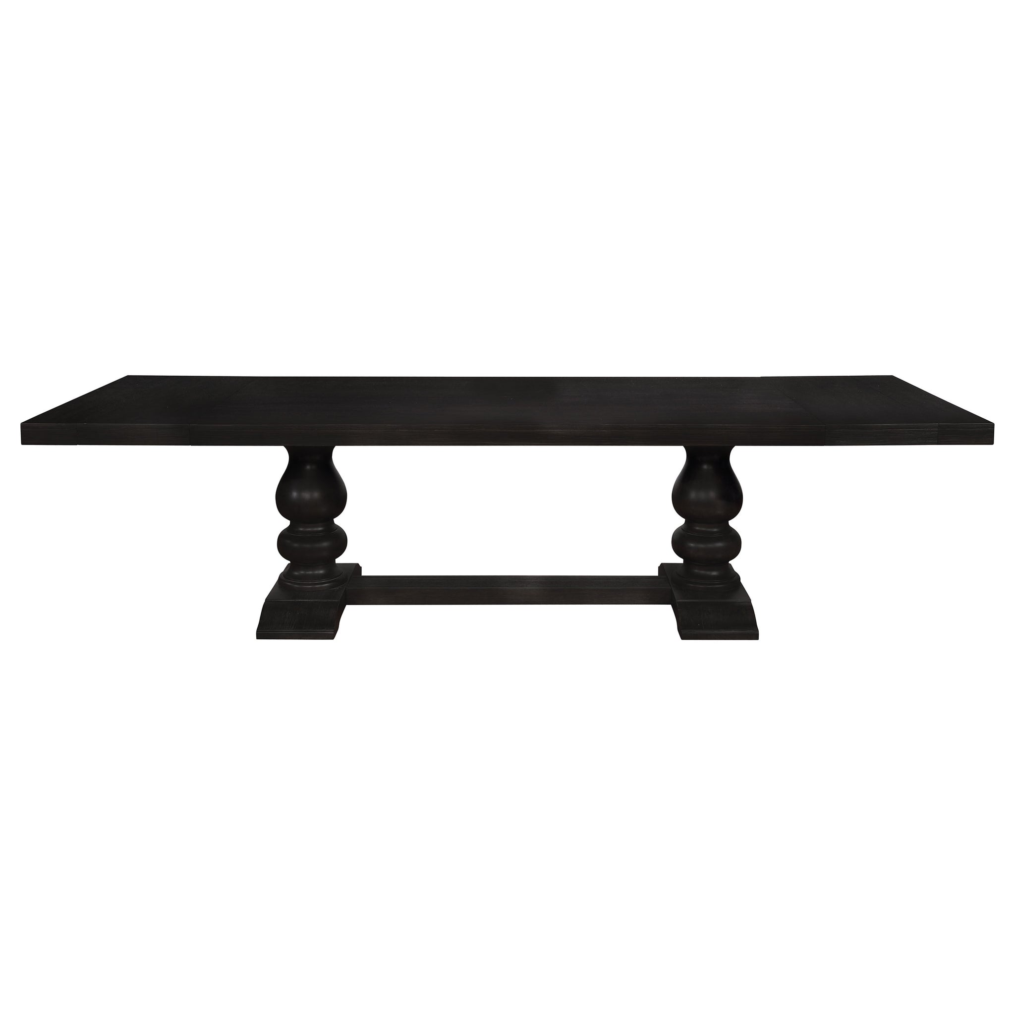 An exceptional dining set is inspired by European decor for a gorgeous dining space. The expansive rectangular tabletop is supported by a dual pedestal base with a stunning silhouette. Find upholstered dining chairs with a rolled backrest design for a traditional chest. The chairs are further enhanced with nailhead trim along with the frame. Supported on tapered legs, the dining seats are bound to provide you with a delightful dining experience.