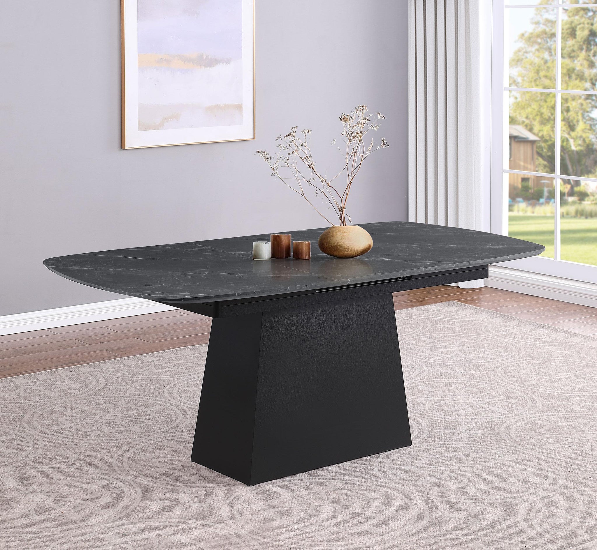This modern dining table blends sleek aesthetics with functional versatility. The black marble-printed melamine tabletop offers a luxurious look while being scratch- and water-resistant for everyday durability. Its expandable design includes a 15. 75-inch self-storing leaf, allowing the table to extend from 57 inches to 72. 75 inches to accommodate additional guests. A bold, trapezoid-shaped base with a black hammer-tone powder-coated finish provides sturdy support, making this table a stylish centerpiece for contemporary dining spaces.