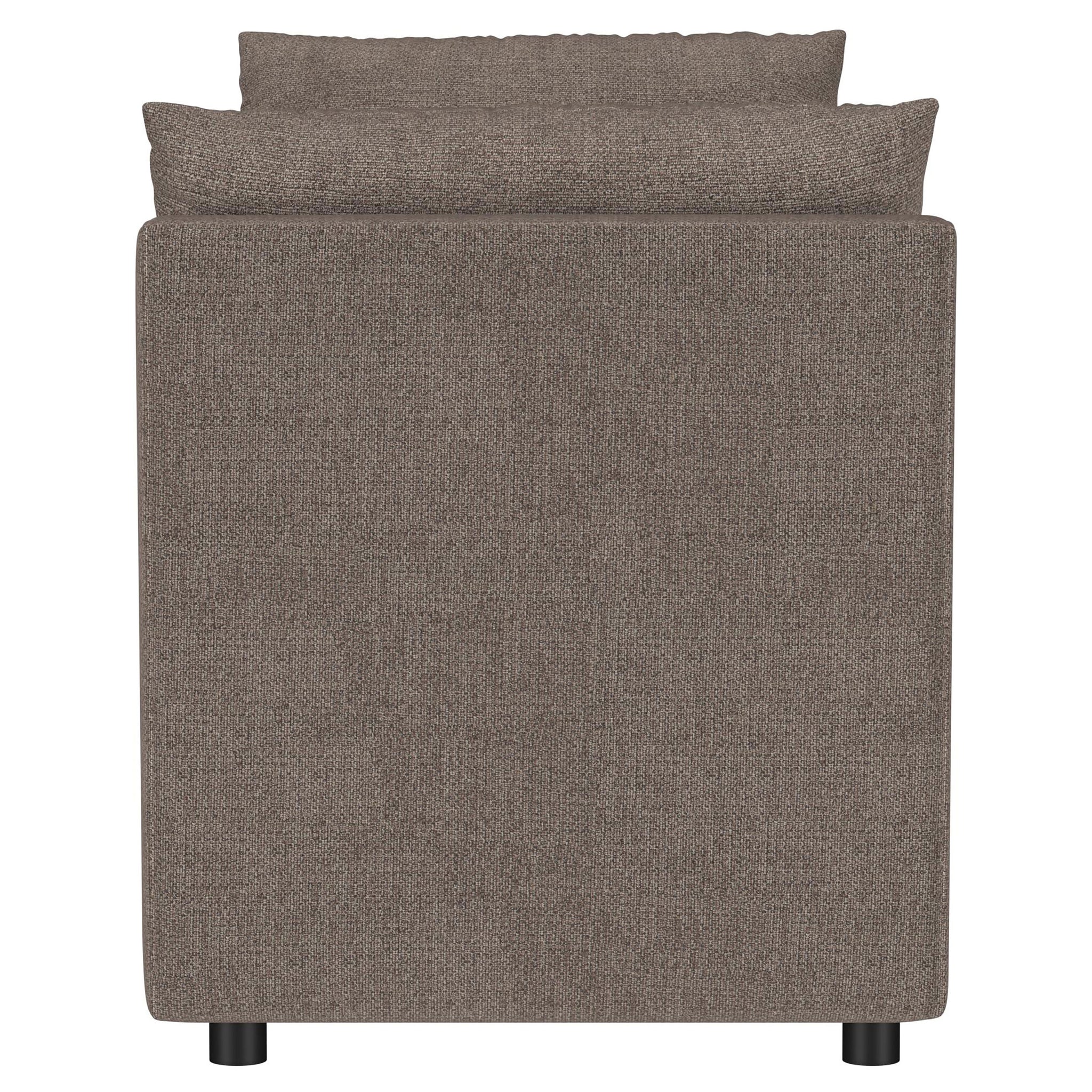 Create a chic spot for lounging or relaxing with a modern upholstered bench. With plush foam cushions and accent pillows, this backless design is ideal for a cozy primary suite or stylish living room. It features Asian hardwood framing for excellent durability, and is covered in dimensional brown upholstery. Its neutral palette is rich and refined, easily blending in myriad spaces and surrounding decors. The bench includes gently rounded arms that add a sense of structure, and a pair of accent pillows that add inviting softness.