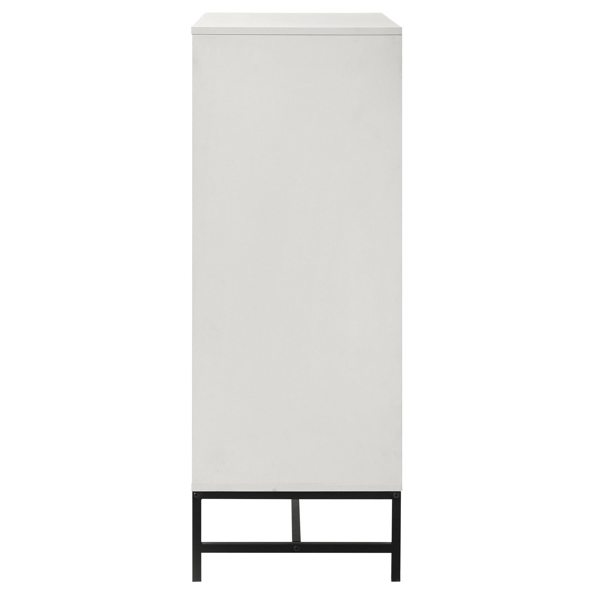 Create ample storage with the compact footprint of a modern four-drawer chest. Its roomy drawers are ideal for clothing, linens, and accessories, helping to keep your personal space tidy and organized. A white finish complements straight, clean lines, while black hardware adds contrast and depth. complementary metal base in black adds light, airy ambiance. Use the top for decor like photos, or add a jewelry box for a personal touch.