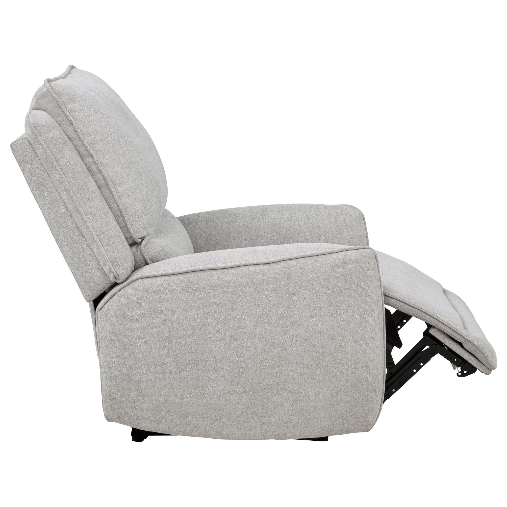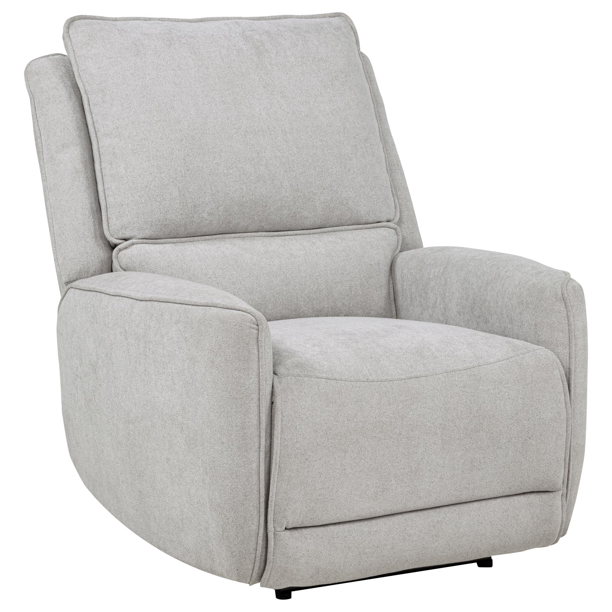 Sink into indulgent comfort with this power recliner, tailored for quiet moments and deep relaxation. Draped in soft dove grey chenille, it features sculpted cushions and gently rounded arms for an inviting silhouette. At the touch of a button, the seat extends smoothly, offering effortless recline. A built-in anti-pinch safety function halts motion when resistance is detected, making it a haven of both comfort and reassurance. Key Features: • Power recliner with sculpted form and plush padding offers cozy, modern comfort • Dove grey chenille upholstery adds softness with a clean monochrome finish • Push-button recline delivers smooth motion for customizable lounging • Supportive seat and back cushions cradle the body in relaxed alignment • Anti-pinch mechanism stops recline when resistance is detected for safety • Wrapped in soft chenille over foam with a durable wood and metal frame