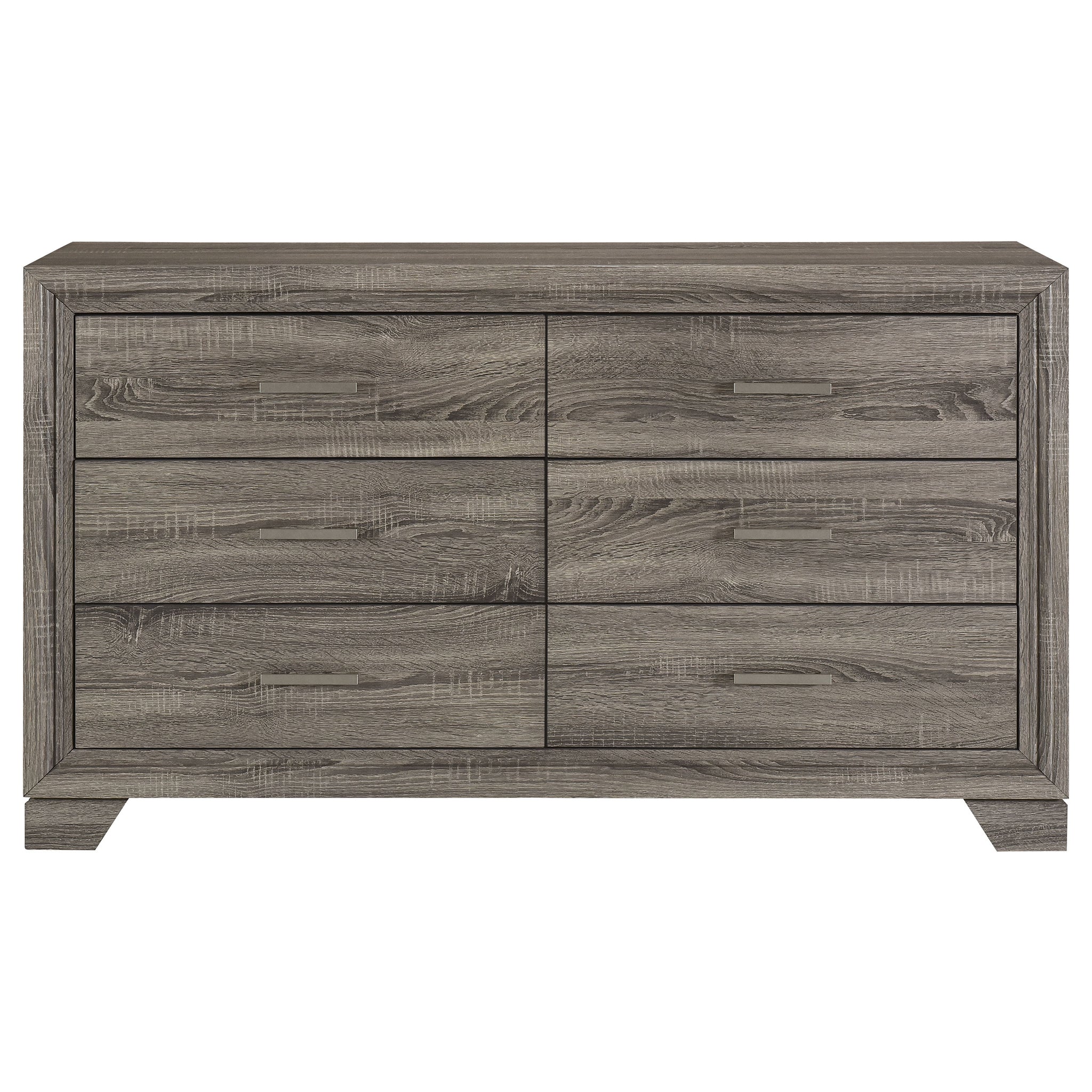 Introduce gracious style in an approachable, tailored bedroom suite with this transitional six-drawer dresser. Designed to augment clothing and accessory storage, it's built with six roomy drawers, all complete with center metal glides for smooth performance. Its exterior features engineered wood and laminate construction, creating durability and reliability. Its case is encased in mitered trim and stands on singular block legs, adding a sense of precision and character. Bar handles complete the stylish look while its wide top allows for a curated selection of decor brings a personal touch.