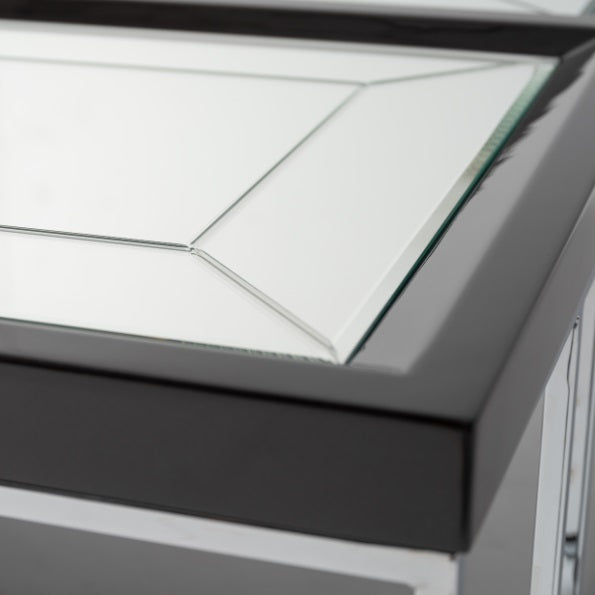 AICO Furniture Carmela Cocktail Table in Glossy Charcoal Sand LFR-CRMA201-830. The Carmela cocktail table is a masterpiece of design, featuring slender silver legs that give way to a seductive charcoal sand top. The four mirrored inlay squares with in the tabletop create an alluring play of light and dimension that will captivate your guests and leave them breathless.