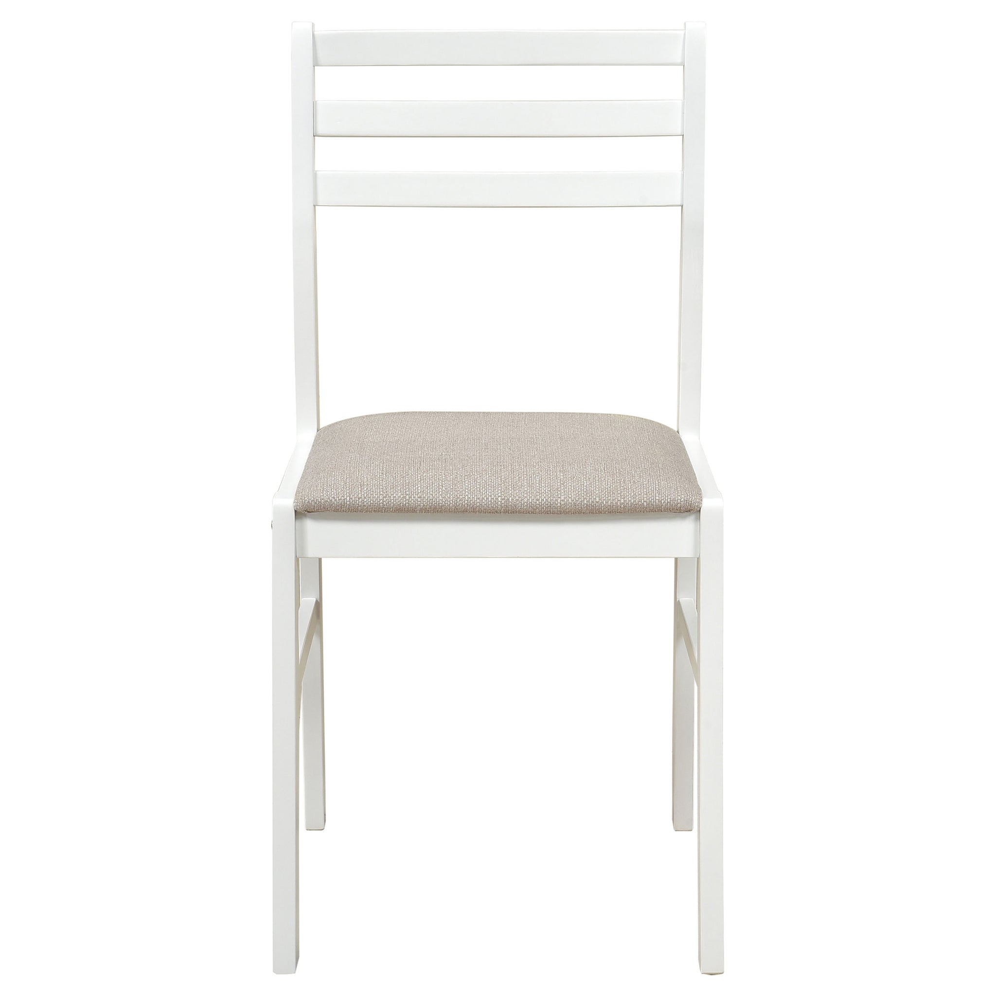 This lovely dining set lends an elegant touch of simple sophistication to a kitchen or breakfast nook. It comes complete with a lovely, round dining table and two comfy chairs upholstered in soft, light brown, padded fabric. The table is enhanced by a versatile drop-down extension which can be raised to accommodate an elaborate dining setup. Lowering it allows you to cozy up closely with a special someone over a leisurely breakfast or romantic, candlelit meal. A smooth, polished, natural wood finish gracefully complements the sleek, stylish silhouette of this beautiful three-piece set. Key Features: • Light and airy natural finish dining set is perfect for a casual breakfast nook • Round table with drop down leaves saves space • Chairs feature a contemporary rendition of a ladder back style • Padded seats in tan microfiber • Sold as a three piece all-inclusive set: Table plus two chairs