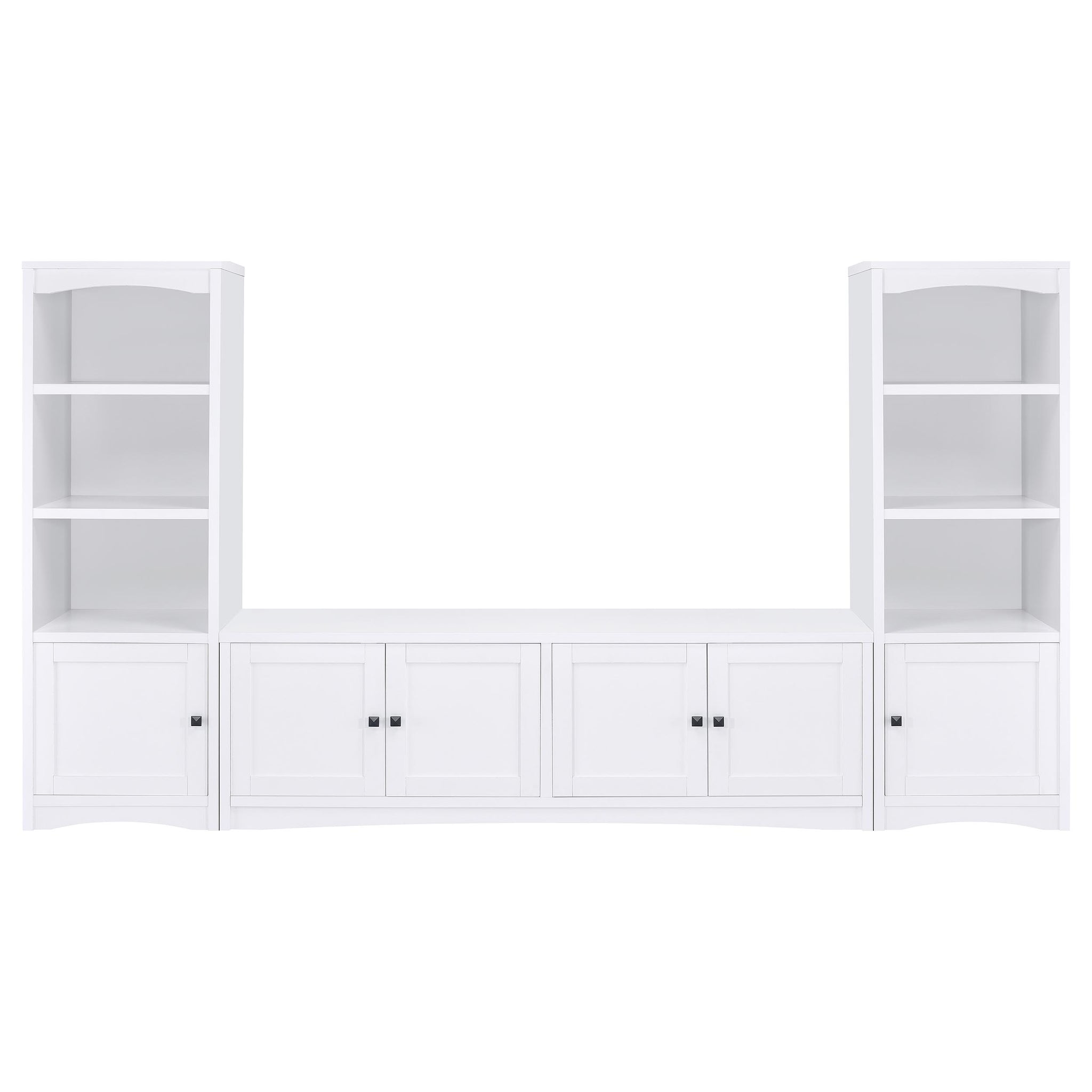 Transform your living space with this beautifully crafted entertainment center, designed to combine style and functionality for your media needs. Anchored by a 78-inch TV stand, this set is perfect for hosting up to an 85-inch television, offering a spacious and organized solution for your home. The TV stand features four doors that open to adjustable shelves, complete with cord management openings, making it easy to keep your media and gaming components neatly arranged. Flanked by two matching media towers, the entertainment center provides additional storage and display options with a mix of open shelving and concealed cabinet space. Finished in a warm, neutral tone, this entertainment center blends seamlessly with any decor, creating an inviting focal point in your living room.