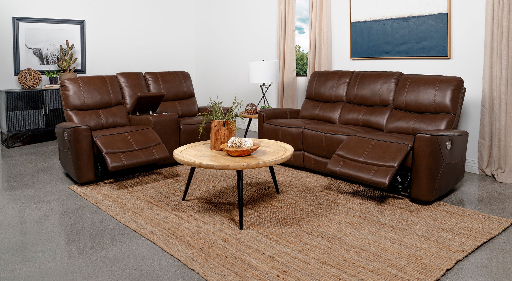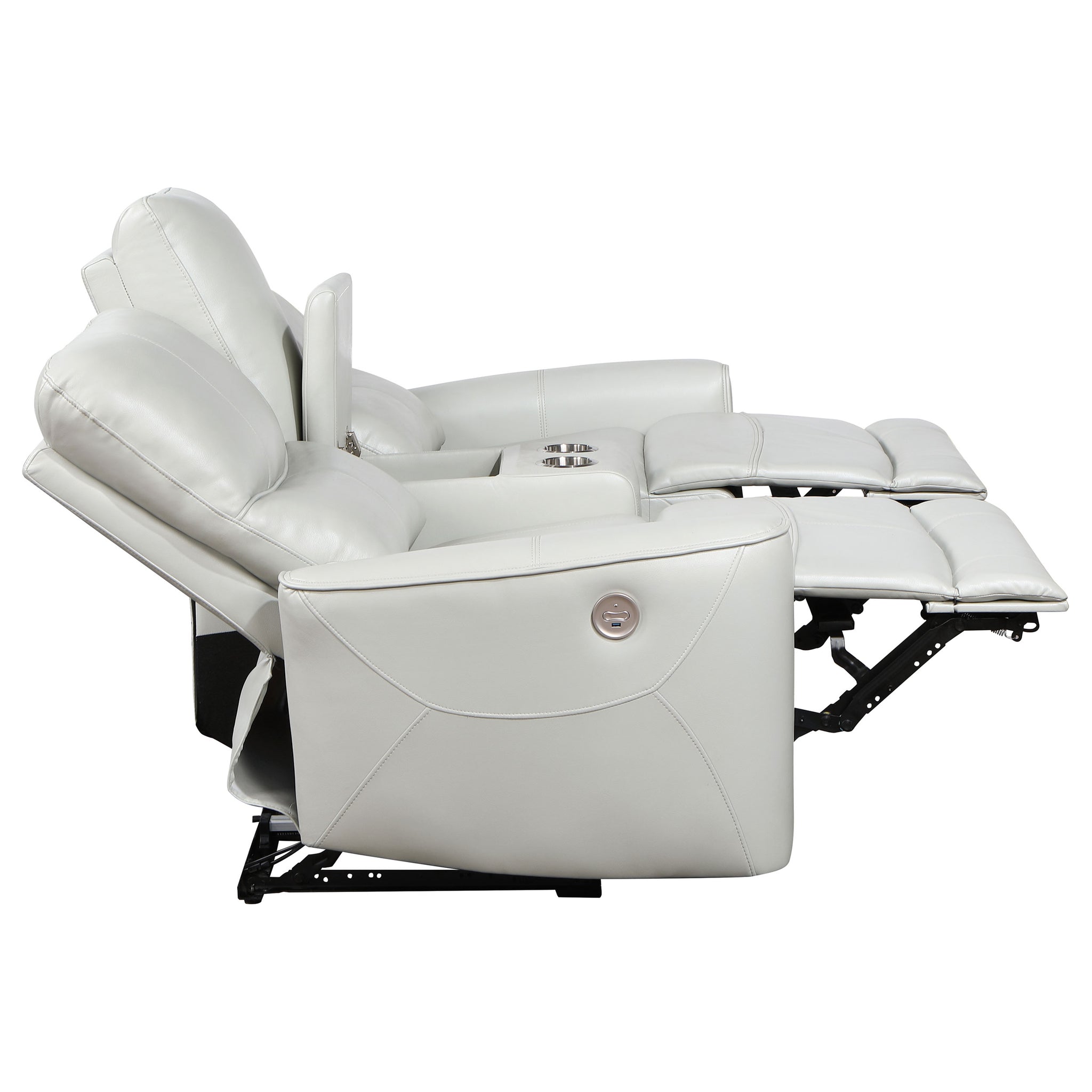 Contemporary elegance plays out in a clean, modern design as the two-piece power sofa set delivers beauty and comfort to a space reserved for easy entertaining and relaxing. Dove grey leatherette upholstery covers wood framing to provide a sturdy build, embellished with plump foam fill in tall, attached back cushions and supportive seat cushions. Embrace subtle tufting on this power sofa and loveseat set creating customized body positioning accessible at the touch of buttons on switch panels with convenient USB ports. Keep beverages within reach and store essentials in a center-mounted loveseat flip-top console and panel. This power set is all that's needed for a relaxing day or evening.