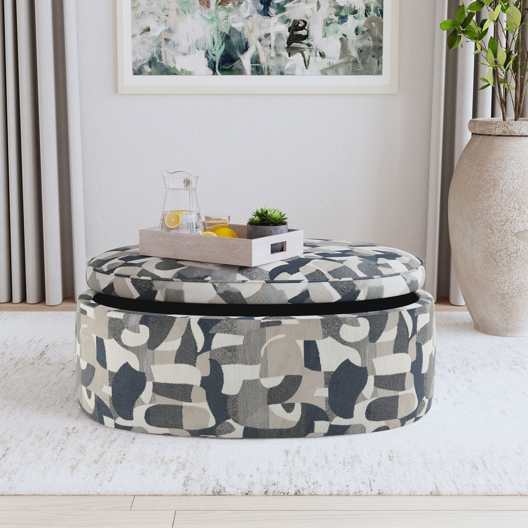 Instill a little texture and pattern at the center of your seating group with a modern storage ottoman. The top lifts to reveal a roomy interior, perfect for stashing blankets, pillows and other essentials in your living room. The padded top is perfect for seating or as a footrest, and it easily replaces a coffee table for a soft touch. It features an abstract pattern in indigo blue with neutral complements, providing an eye-catching accent. It's the perfect complement to neutral sofas and sectionals, creating the perfect touch of dimensionality.