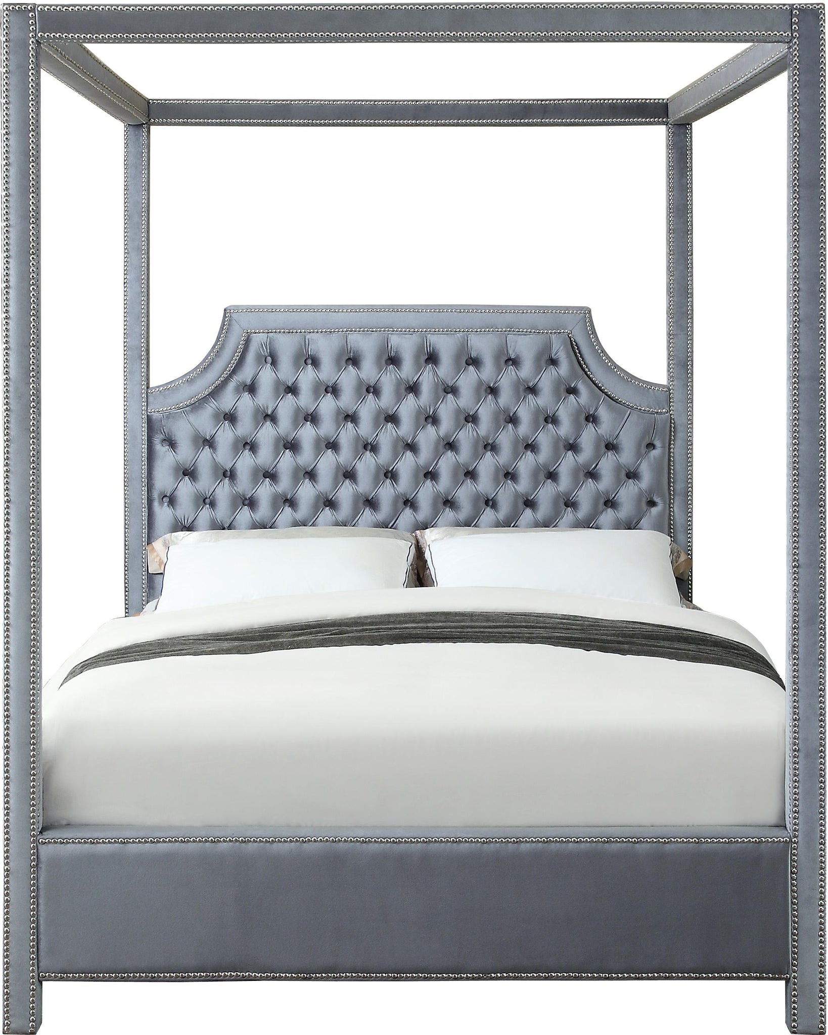 Ensure that every night's sleep is a dreamy escape with this Rowan Grey Velvet Bed as the centerpiece of your bedroom sanctuary. This bed features a velvet-clad canopy that beckons you to rest like royalty. The deeply detailed tufting on the scalloped headboard makes for a sumptuous presentation, and the chrome nail heads add to the luxe look of this exquisite bed.
