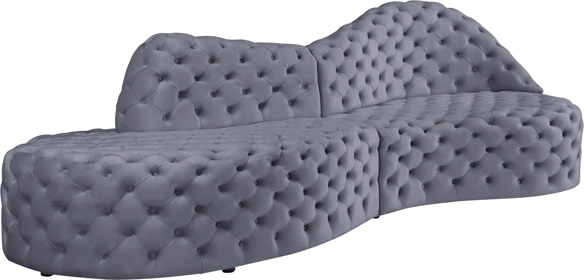 Settle in for family game night atop this Royalvelvet sectional that���s upholstered with soft grey velvet material. This 3-piece sectional has a lot to offer, with its deep seating and extra wide design that gives you oodles of room to move around and get comfy. The tufted design of the arms, back, and seats adds to their durability and soft, welcoming touch. The sectional comes in neutral colors to mesh nicely with other elements in your room.