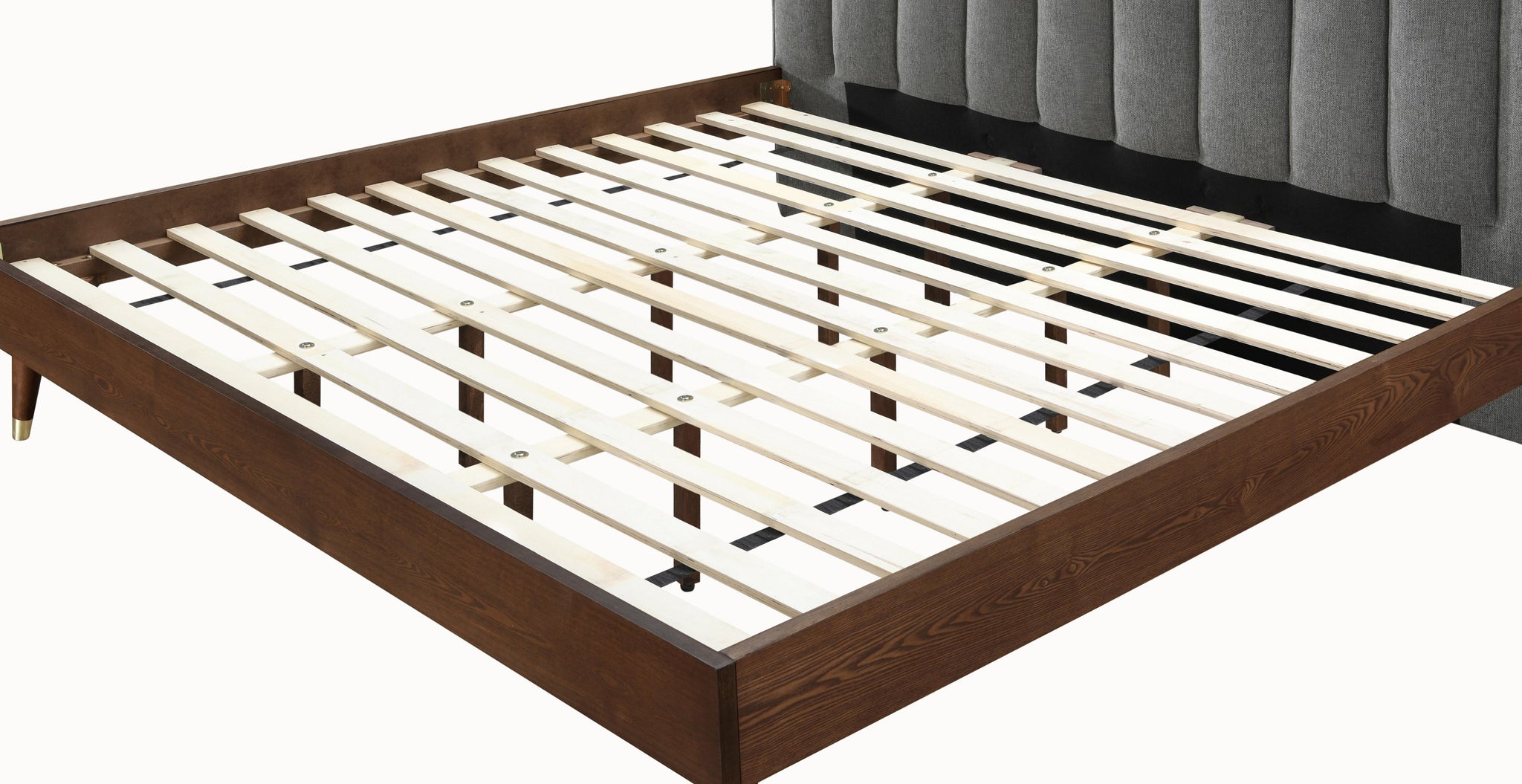 Trust this Vance midcentury modern polyester linen queen-size bed to give your room a totally new look and an elegant vibe. The frame is made from real wood with a walnut finish, so this bed pairs beautifully with the nightstand in the same collection. The linen headboard covered in soft and durable grey linen fabric upholstery for softness and comfort provides an exceptionally contemporary yet midcentury slant.