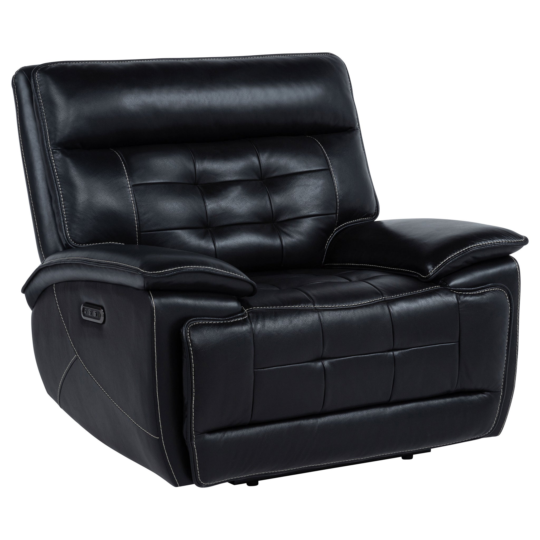 Commanding comfort and tailored power define this leather dual power recliner chair. Upholstered in black top grain leather everywhere the body touches, it features dual power controls for independent adjustment of the headrest and footrest. A built-in control panel includes dual USB ports with both USB-A and USB-C for effortless charging. Channel tufting and contrast stitching add refined dimension to its bold, supportive form. Key Features: • Dual power recliner with independent headrest and footrest adjustment functions • Top grain leather where the body touches offers a smooth, high-end seating feel • Control panel includes dual USB ports with USB-A and USB-C for device charging • Channel tufting adds support and visual texture to seat and backrest zones • Contrast stitching outlines the form with modern, tailored definition • Plush padded arms and deep cushioning provide full-body relaxation and support
