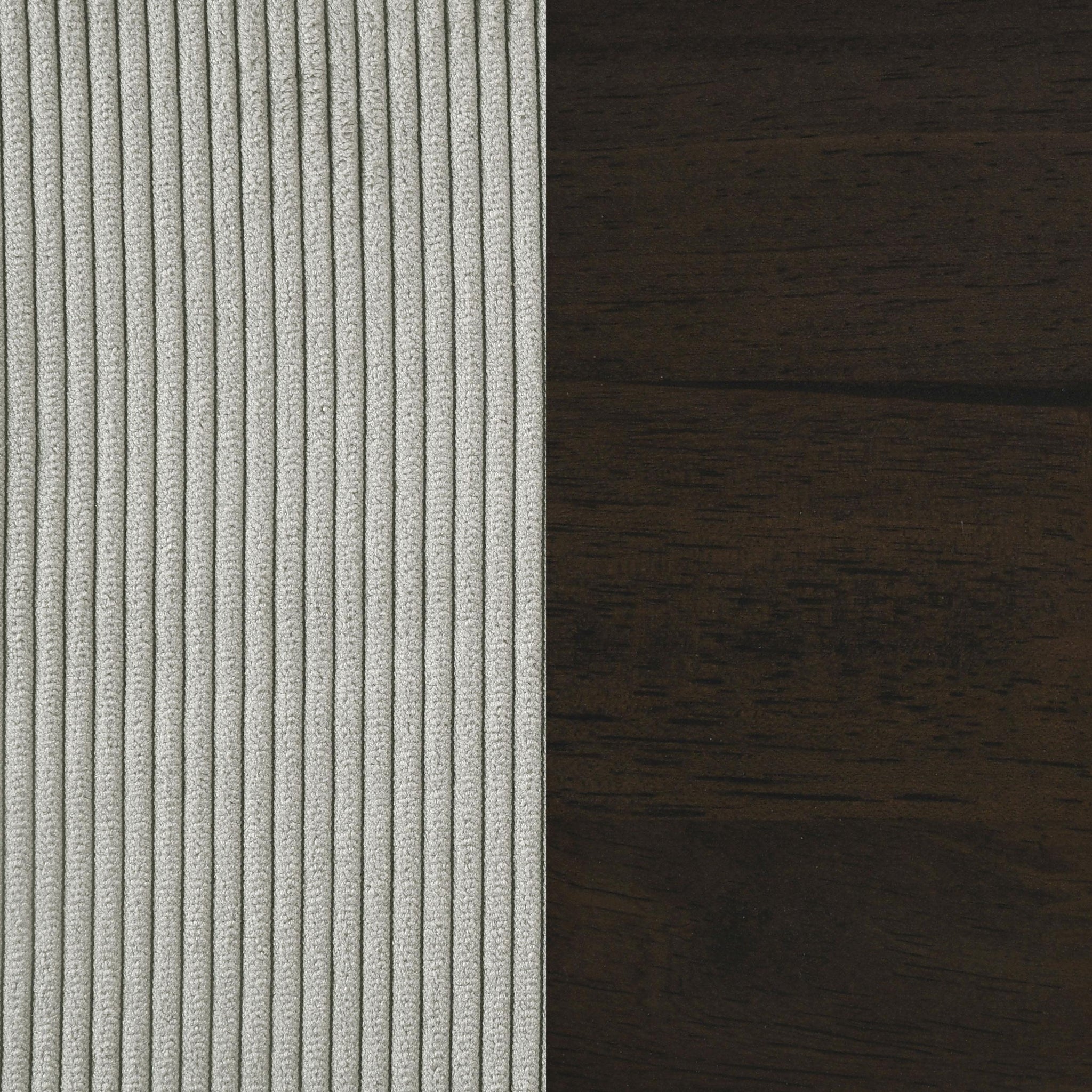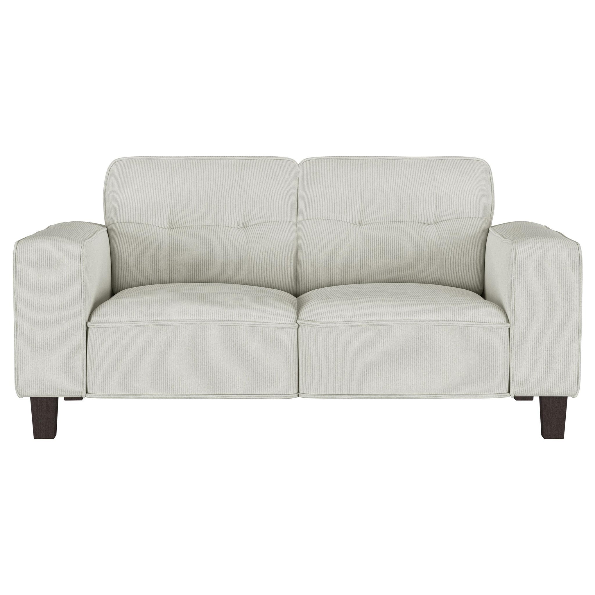 Infuse tailored elegance with the tufted details of a modern sofa set. Featuring a three-seat sofa and two-seat loveseat, this set offers a refined anchor for your living room seating. Smooth, soft upholstery adds neutral color, while plush foam and sinuous springs ensure optimal comfort. The sofa and loveseat each feature tufted back cushions, offering a refined touch of mid-century charm. Track arms define a straight, clean-lined silhouette that's simply timeless and each piece stands on dark brown finished tapered wooden legs that add airy height.