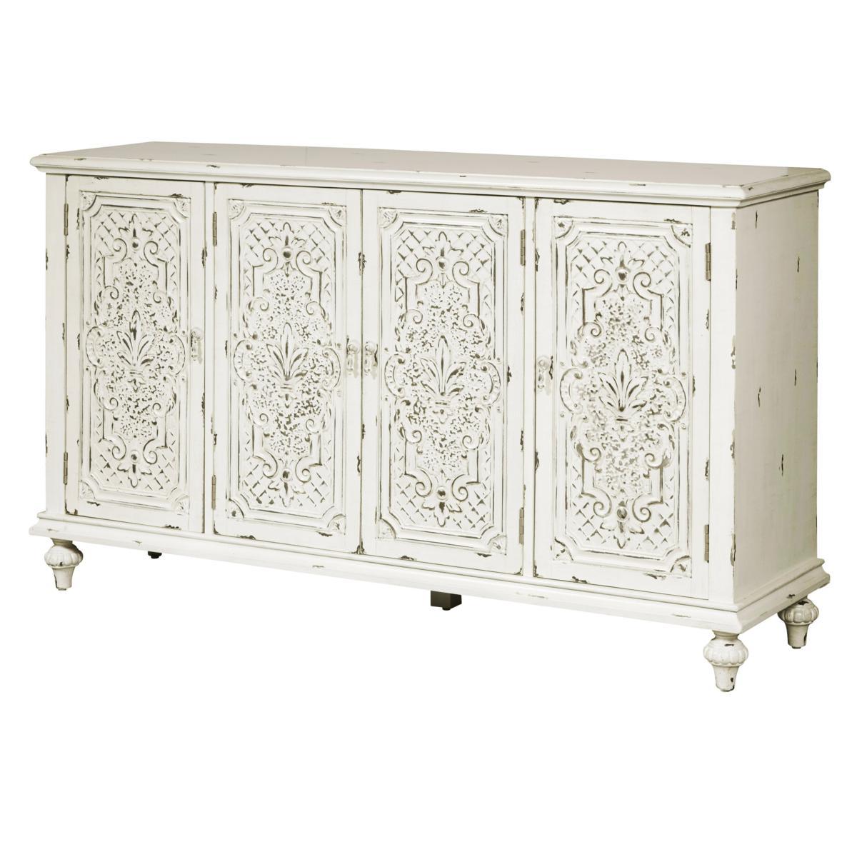 - Distressed cream finish uses a heavy rub-through effect to emphasize design textures