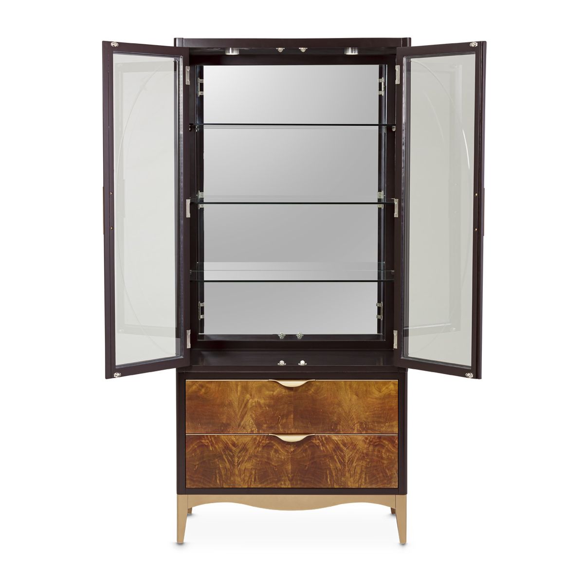 AICO Malibu Crest Display Cabinet in Crotch Mahogany 9007209-412. Display your sophisticated taste with the Malibu Crest Display Cabinet! It features three levels of glass shelving and a fully mirrored back panel that optimizes the LED display lighting. Watch your china and accents reach a level of illumination you never expected.